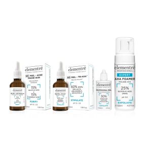 Elementré presenteert een innovatieve lijn van multifunctionele chemische peelings. De peelings zijn ontwikkeld om aan de behoeften van verschillende huidtypes te voorzien, en richt zich op het boosten van de huidcellen in verheldering, verjonging, vermindering van acné en huidimperfecties (post-acné littekens en vlekjes).